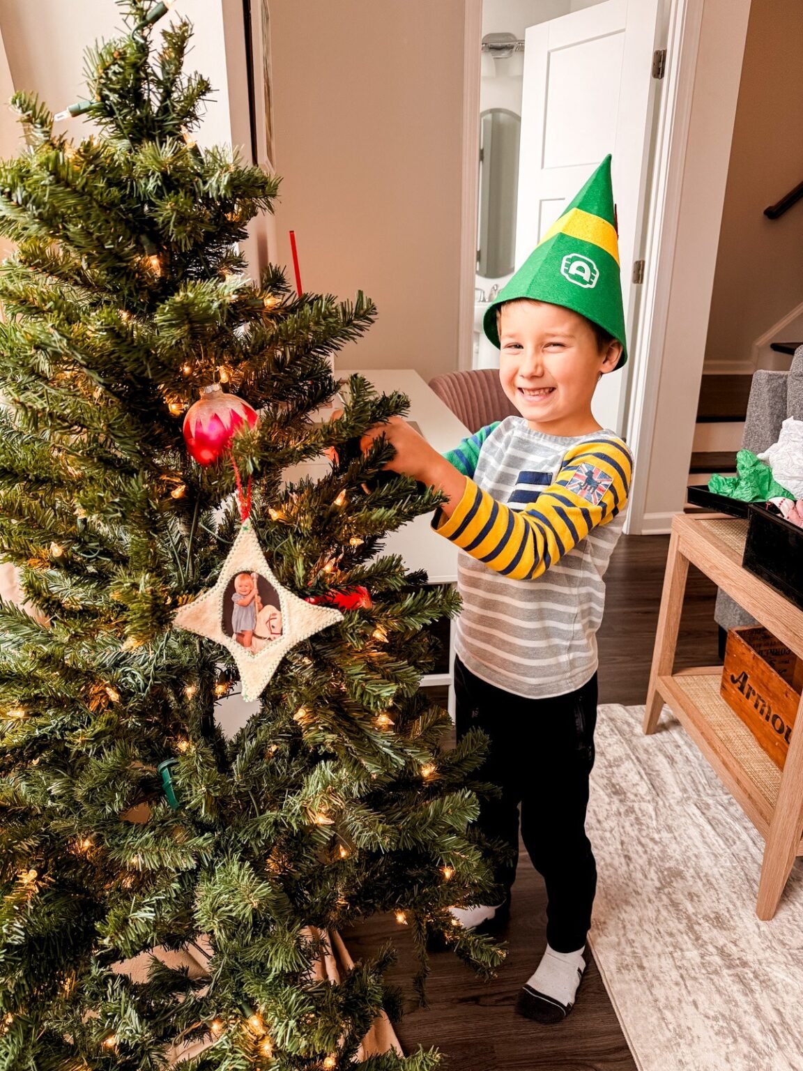 We’ve been doing lots of fun holiday activities over the past few weeks, including decorating our perfect little Christmas tree. I was a bit overwhelmed thinking about hauling a real (tall) tree up to my second floor (hello pine needles) and also didn’t have a stand, so when some neighbors posted a moving sale and this petite tree was listed for $10, I jumped on it! I’d already looked at some artificial trees online and they were all over $100. I was thrilled to take this pre-lit one off their hands! While I do think a real tree has so much charm and smells delicious, I think I’m going to stick with this guy for a few years at least! Tis “my” season for that.